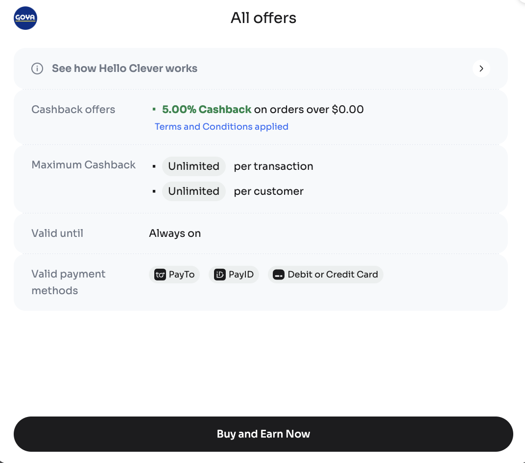 You can hover on the "i" icon to view detailed cashback terms and available payment methods. You can find the cashback percentage, maximum cashback per transaction, and eligible payment options here.