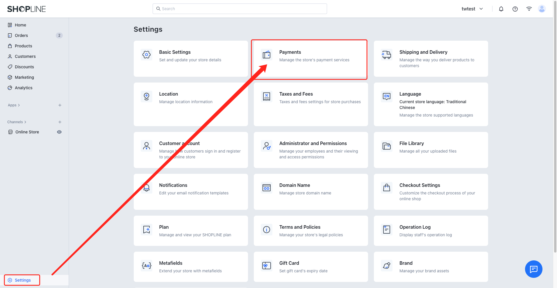 2. Navigate to Settings > Payments from the bottom left corner of your dashboard.