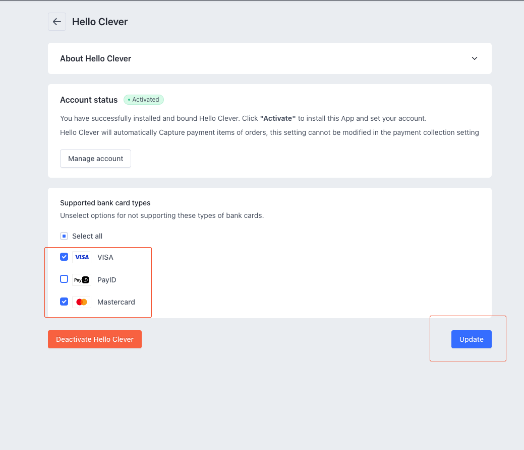 4. Select the payment options you want to display to customers during checkout. For example, you can enable options like PayID, Bank Transfer, or others supported by Hello Clever.