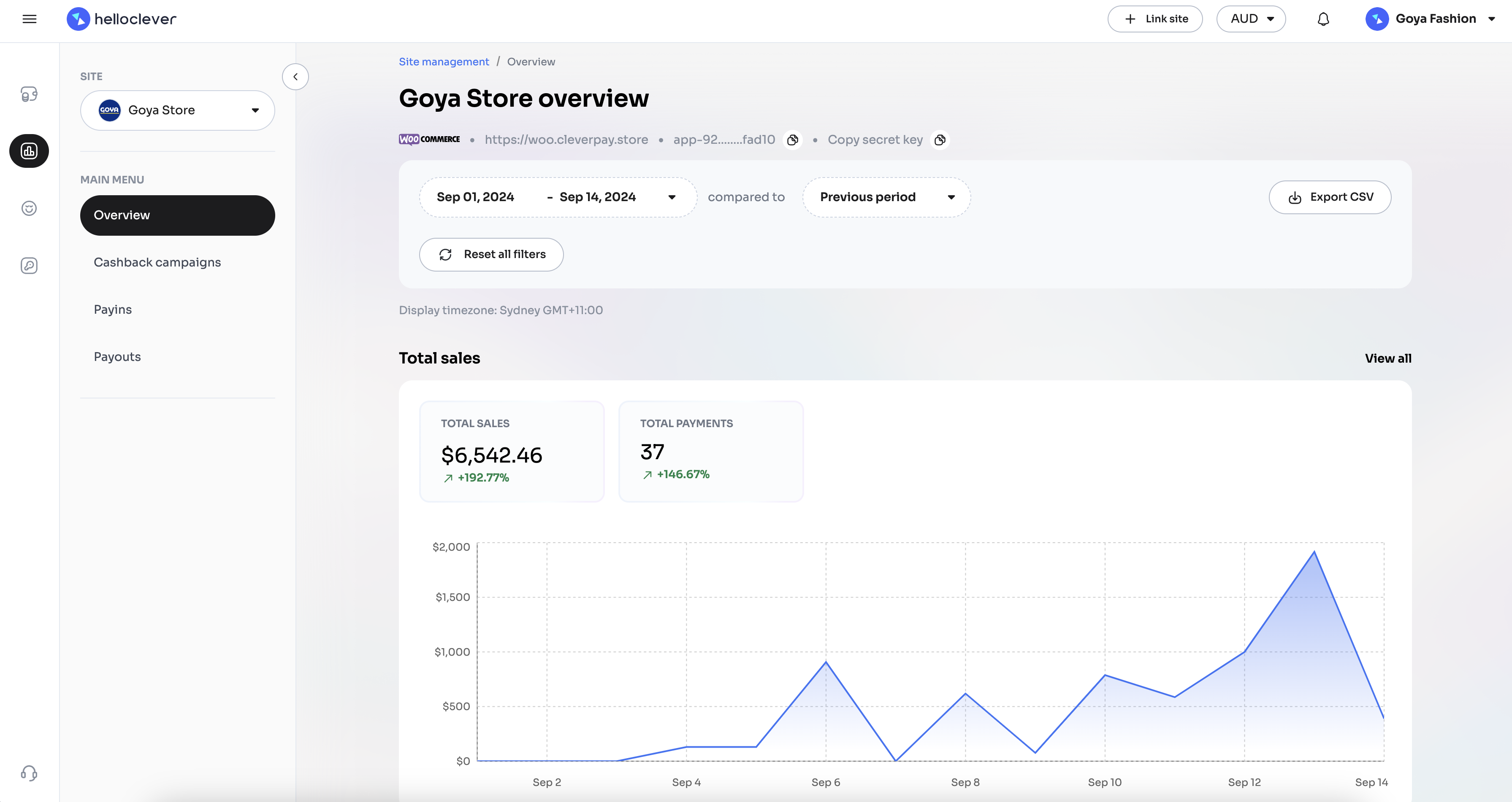 In the Overview screen, you can see a comparison of your site’s performance metrics between two consecutive time periods. By selecting a period (e.g., "Sep 1, 2024 - Sep 14, 2024") and choosing compared to Previous Period, the system will calculate and display the percentage change in key metrics like Total Sales and Total Payments.