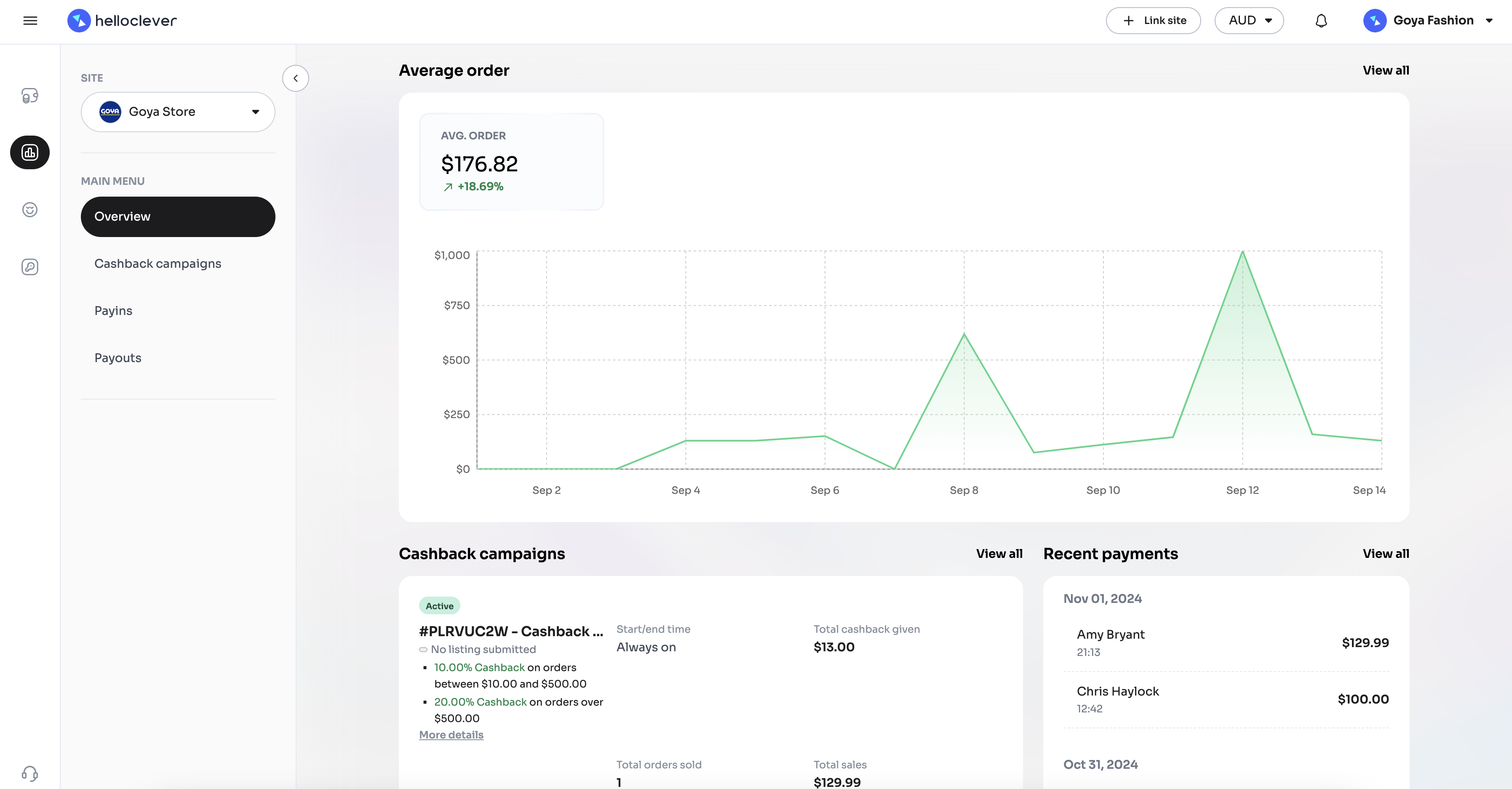 Cashback Campaigns: Displays information about active cashback campaigns, helping you see their direct effect on sales. If a campaign is performing well, it may be reflected in increased sales volume or higher average order values.