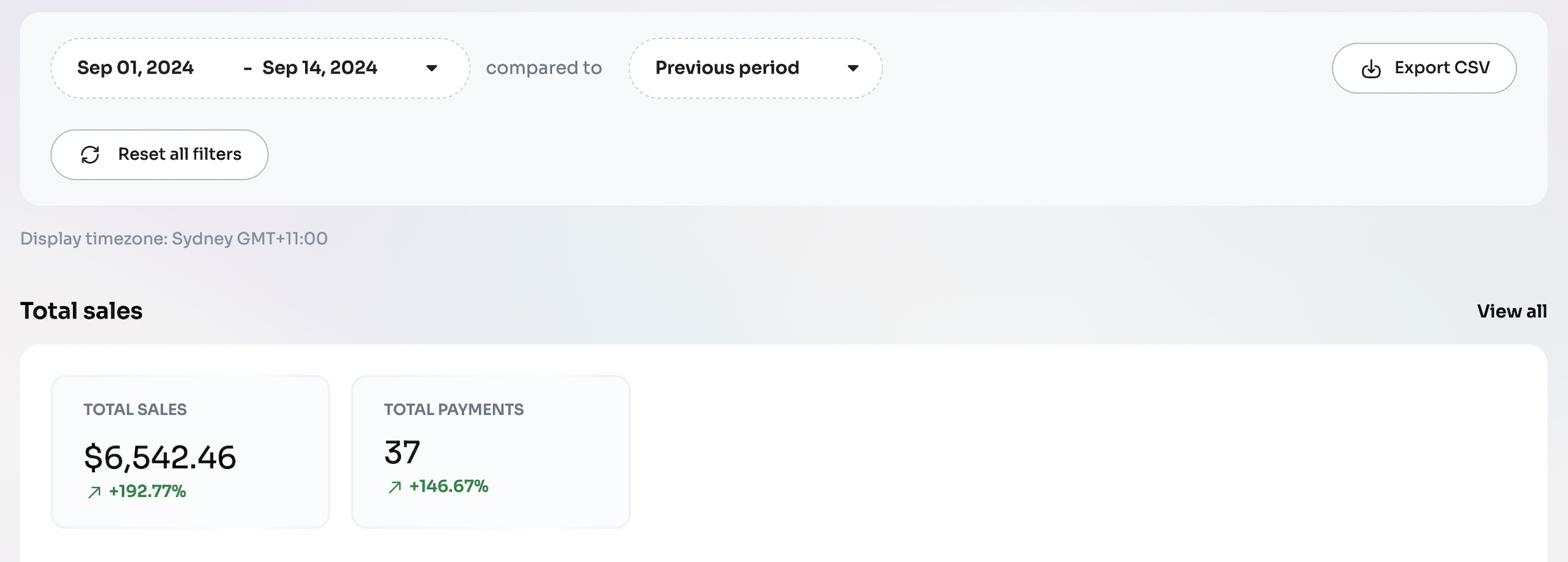 This comparison allows you to see how your site’s performance has changed over time. For example, if the Total Sales metric shows +192.77%, this means that sales increased by 192.77% compared to the immediate previous period of the same length of time. Similarly, if Total Payments shows +146.67%, it indicates an increase of 146.67% in the number of payments made compared to the previous timeframe.