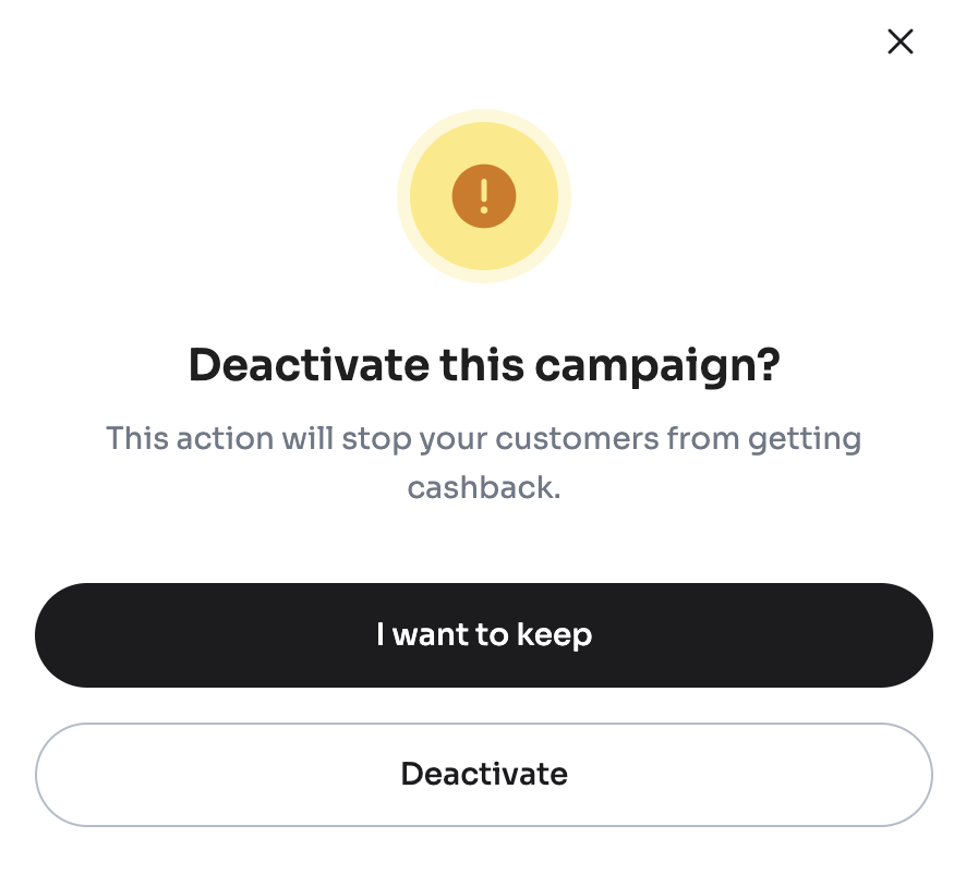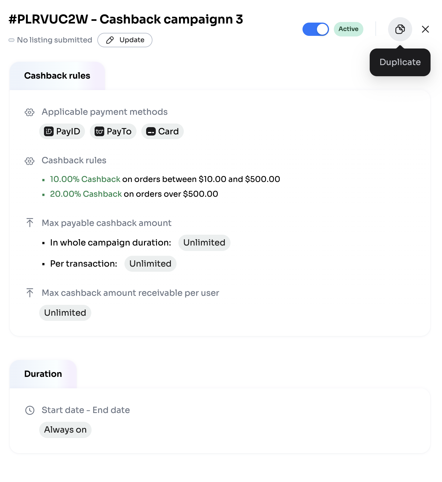 To update the cashback rules of a campaign, you’ll need to duplicate the current campaign and then deactivate the original one.